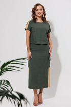 Юбка прямая, зауженная книзу, длиной миди, с высокой посадкой, с поясом из эластичной тесьмы. На переднем полотнище разрез в вертикальном шве.