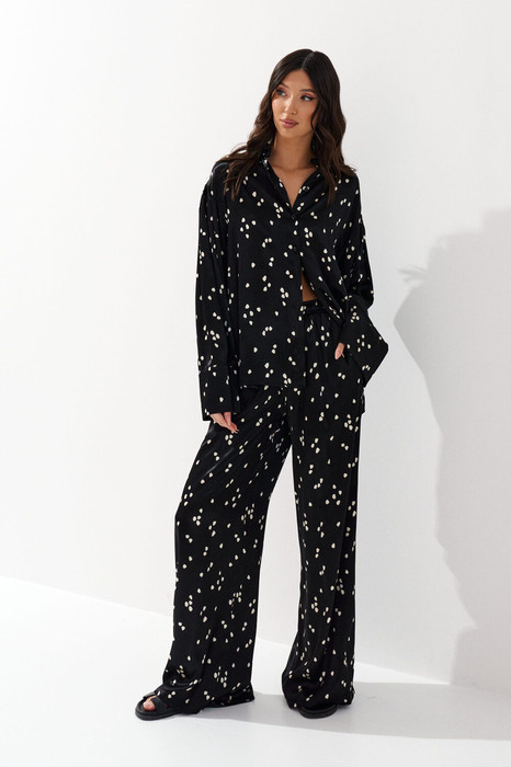 Комплпект состоит из рубашки и брюк выполнен из черной ткани с контрастным белым принтом. Характеристики: рубашка прямой крой, отложной воротник, застежка центральная на петли пуговицы, в боковых швах разрезы, рукав свободного кроя - спущен, по низу рукава манжета, спинка отрезная с декоративной сборкой. Длина по спинке 66 см, длина рукава 81 см. Брюки прямого кроя, пояс брюк на резинке с кулиской, в боковых швах карманы. Длина 110 см.