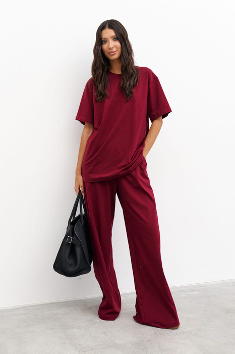 Комплект 2-х предметный, состоит из футболки и брюк выполнен из хлопкового полотна цвета бордо. Характеристики: футболка прямого свободного кроя, овальный вырез горловины, рукав втачной спущенный . Длина по спинке от края горловины 70 см, длина рукава от края горловины 37 см. Брюки прямого свободного кроя, пояс на резинке, в боковых швах карманы. Длина брюк по боковому шву 112 см.