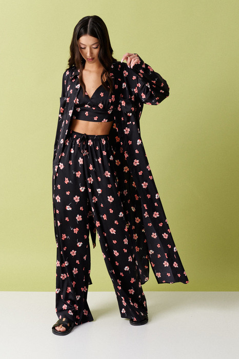Комплект из топа, кардигана и брюк, выполненный из черного полотна с цветочным принтом. Характеристики: Топ укороченный, фигурный вырез горловины, узкие бретели, по спинке резинка со сборкой, по переду под лифом стабильная вставка, застежки в изделии нет. Длина изделия 28 см. Кардиган прямого кроя , отложной воротник, застежка центральная на петли пуговицы, по переду крупные карманы, рукав втачной, по низу рукава манжета на пуговичке, по линии талии шлевки, в комплекте пос из ткани основного изделия, в боковых швах разрезы 73 см. Длина по спинке 130 см, длина рукава 60 см. Брюки прямого свободного кроя , пояс брюк на резинке, в боковых швах карманы. Длина 110 см.