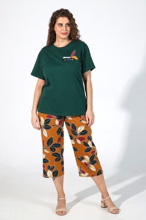 Костюм женский из трикотажного полотна, состоящий из футболки и бриджей.Футболка женская из гладкокрашеного трикотажного полотна «кулирка» классического покроя, с короткими втачными рукавами, горловиной овальной формы, обработанной втачной планкой, и принтом на полочке, выполненным в технике шелкографии.