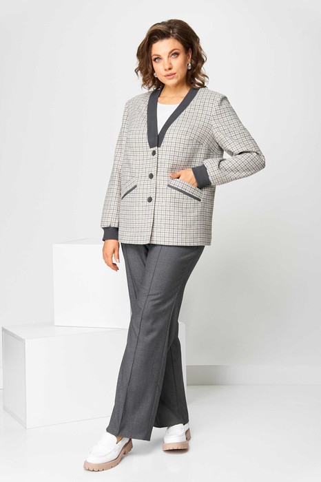 Комплект женский состоит из жакета и брюк. Жакет полуприлегающего силуэта на подкладке. По переду нагрудные вытачки и карманы. Жакет с центральной застежкой на петли-пуговицы. Горловина c V-образным вырезом. Горловина и манжеты обработаны довязом "кашкорсе". Рукав вточной двухшовный с манжетой. Брюки из костюмной ткани, карманами в боковых швах. Брюки классические, на поясе с резинкой. Застежка на гульфик, на тесьму-молнию.
