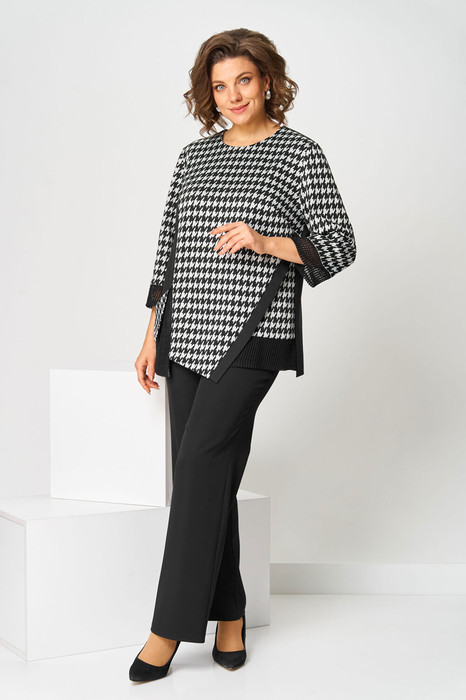 Костюм брючный (двойка) женский полуприлегающего силуэта, состоит из джемпера и брюк. Костюм выполнен и трикотажного полотна и брючной ткани. Джемпер выполнен из трикотажа. На передней половине джемпера карман, водящий в рельеф. К левому боковому шву наискосок расположена декоративная планка По низу рукавов, карманов вставки из ткани "сетка".  Брюки классические,  на поясе с резинкой. Застежка на гульфик, на тесьму-молнию. Вверху косые карманы.