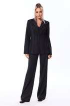 Костюм 2-предметный: жакет и брюки. Двубортный жакет на подкладке, прямого силуэта. Обработаны прорезные карманы по переду. Рукава втачные одношовные, обработаны шлицей.  Брюки прямого кроя, длинна 7/8, застёжка- гульфик , по юоковым вам обработаны карманы
