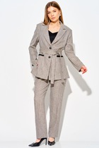 Костюм 2-предметный: жакет и брюки. Жакет однобортный прямого силуэта, на подкладке. По переду обработаны накладные карманы, а также пррорезной карман. Жакет выполнен из плотного денима, а ткаже их костюмной ткани. Брюки прямого силуэта, выполнены из плотного денима, с разрезами по переду. Застёжка - гульфик