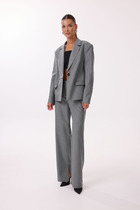 Этот 3-х предметный комплект состоит из жакета, корсетного топа и брюк. Жакет - настоящая жечужина в гардеробе.  Небанальный вариант застёжки сбоку на лицевой стороне, и потайной пуговицей внутри  изделия придаёт жакету характер, подчёркивает силуэт и линию талии. Жакет выгодно акцентирует фигуру, создавая утончённый и женственный образ. Благодаря декоративным рюшам из вуали, он легко станет центральным элементом образа. Карманы с клапанами.    Корсетный топ с открытыми плечами — воплощение чувственной элегантности. Открытые плечи подчеркивают линию шеи и ключиц, а корсетный крой создает безупречный силуэт. Роскошный силуэт и акцентная баска делают его идеальным выбором для особенного вечера. Также топ отлично вписывается в повседневные образы.    Брюки станут глотком свежего воздуха среди широких силуэтов и брюк палаццо. Их облегающий крой подчёркивает линию бедёр и тали, а затем изящно расклешается от колена.Такой фасон позволит скорректировать фигуру и подойдёт для строго дресс кода. Вертикальные линии по центру брючин вытягивают силуэт и удлиняют ноги. Застёжка классическая - молния и пуговица в цвет изделия.