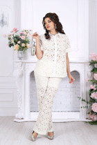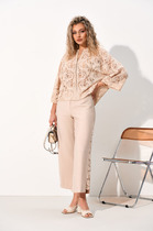 Комплект брючный женский, состоящий из блузы и брюк. Блуза свободного покроя со спущенной линией плеча, без рукава, по низу изделия манжета, в которой сзади вставлена эластичная тесьма, по переду от горловины до низа изделие-вставка из ткани с пайетками, вырез горловины "лодочка". Брюки узкие, на поясе -кокетке, по спинке с эластичной тесьмой, длина 7/8, с разрезиками по низу, со стрелками.