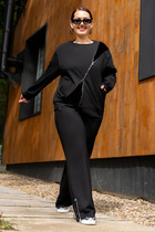 Комплект женский, состоящий из джемпера и юбки. Джемпер покроя "летучая мышь" с 3/4 рукавом, вырез горловины "лодочка", по переду ассиметричные подрезы и драпировка, от горловины-вставка из тесьмы пайеток и камней, как декоративный элемент. Юбка прямая на поясе с эластичной тесьмой.