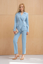 Комплект женский брючный, состоящий из жакета и брюк. Жакет прилегающего силуэта, 2-бортный с отложным воротником, край борта со скосом и углами внизу,по переду карманы, рукав втачной 2-шовный со шлицей по низу рукава. На полуподкладке. Брюки узкие на поясе-кокетке, с боковыми карманами, с застёжкой спереди на молнию и пуговицы, по поясу шлёвки. Внизу брюк внутри разрезики. Брюки со стрелками.