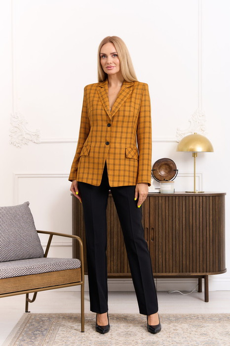 Комплект женский, состоящий из жакета и брюк. Жакет прилегающего силуэта с вертикальными рельефами от проймы по переду и спинке, с отложным воротником, с застёжкой спереди на петли и пуговицы, рукав вточной 2-х шовный со шлицей, по переду карманы с клапаном. Изделие на подкладке. Брюки прямые, зауженные к низу, на поясе-кокетке с застёжкой спереди на молнию и пуговицу, с боковыми карманами, со стрелками и шлёвками.