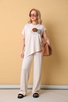 Комплект женский брючный, состоящий из кардигана и брюк. Кардиган прямого силуэта, вырез горловины круглый, рукав длинный на спущенной пройме, застежка спереди на петли и пуговицы, по переду-накладные карманы, низ изделия фигурный, разной длины по переду и спинке, с разрезиками в боковых швах. Брюки из трикотажа с эластаном, зауженные к низу, в поясе по задней части-эластичная тесьма, по передним половинкам брюк-карманы, изделие без застежки.