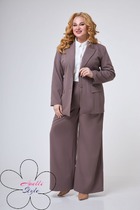 Комплект женский  состоящий из жакета и брюк. Жакет прилегающего силуэта с застёжкой спереди на пуговицы, с отложным воротником с лацканами, с фигурным подрезом  по переду и спинке и вставкой из сетки, с карманами по переду, с втачным рукавом. Изделие на подкладке. Брюки узкие, на поясе-кокетке, с застёжкой спереди на молнию и пуговицы, с боковыми карманами и стрелками.
