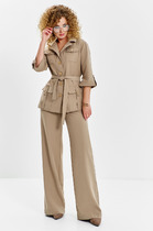 Брюки прямые,по переду с отлетными деталями на запах, на двойном притачном поясе с резинкой по кругу.