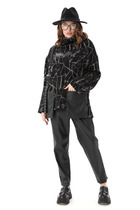 Блуза прямого силуэта.Перед с нагрудными вытачками из плечевых швов , асимметричным низом и декоративной планкой слева.Спинка со средним швом и V-образным вырезом горловины с планкой и декоративной пластинкой.Плечи спущены.Рукава одношовные длиной 3/4 по низу двойные притачные манжеты.