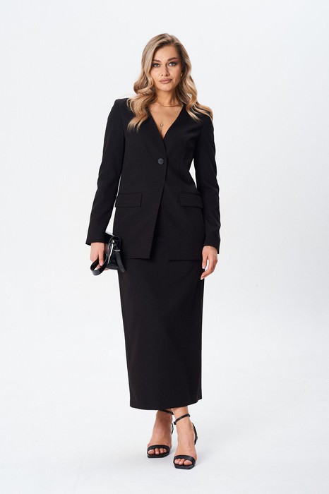 Юбка карандаш длинная. Застежка сзади в среднем шве на потайную молнию. Пояс притачной с застежкой на петлю и пуговицу. Сзади в среднем шве разрез длиной 30 см. Юбка на подкладке.