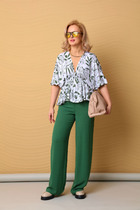 Пояс широкий, в задней части пояса брюк вставлена резинка.