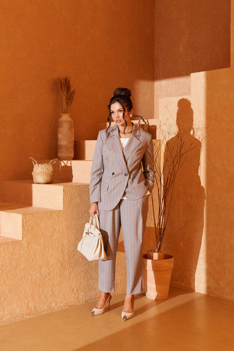 Выразительный комплект состоит из жакета, брюк и блузки. Верхний слой выполнен из мягкой смесовой ткани с натуральными волокнами вискозы, практичный в носке. Блузка – из мягкого вискозного полотна, приятного к телу.