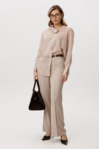 Блуза - поло свободного кроя с отложным воротником на планке визуально удлиняет линию шеи. Рукав втачной с подгибкой по линии низа. На спинке в районе плеча расположены вытачки. В боковых швах - разрезы, обработанные подгибкой. Спинка длиннее переда.