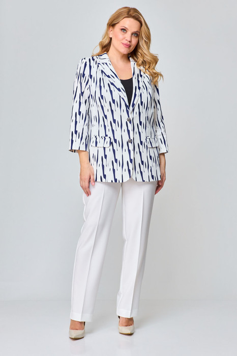 Комплект 2-х предметный из хлопковой ткани, состоит из жакета и и брюк. Жакет женский удлиненный, полуприлегающего силуэта с центральной бортовой застежкой на пуговицы до линии перегиба лацкана. Спереди рельефные швы от плечевого шва, отрезной бочок и карман с клапаном. Спинка с рельефами от плечевого шва. Рукав втачной, двухшовный, 3/4, с небольшим разрезом в локтевом шве. Воротник пиджачного типа. Перед жакета на подкладке. Длина рукава 50, длина по спинке 68 см.Брюки прямые, классические, с заутюженными стрелками, по переду обработаны карманы с отрезным бочком, застежка на тесьму-молнию и 1 пуговицу. На задних половинках обработаны вытачки и имитация карманов с листочкой, пояс в брюках притачной. Длина брюк от талии по боковому шву 103 см.
