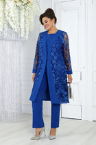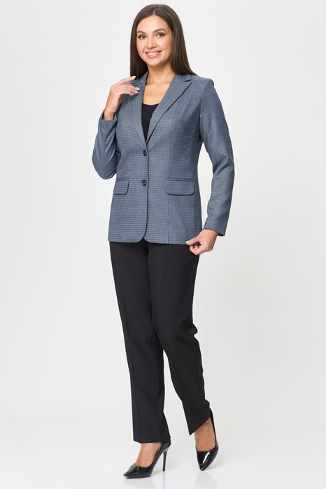 Комплект женский-двойка, из текстильной ткани, жакет удлиненный, полуприлегающего силуэта с центральной бортовой застежкой на пуговицы до линии перегиба лацкана. Спереди рельефные швы от плечевого шва, отрезной бочок и карман с клапаном. Спинка с рельефами от плечевого шва. Рукав втачной, двухшовный. Воротник пиджачного типа. Жакет на подкладке, длина по спинке 67 см, длина рукава 62 см. Брюки прямые,классические, с заутюженными стрелками,по переду обработаны карманы с отрезным бочком,застежка на тесьму-молнию и 1 пуговицу.На задних половинках обработаны вытачки и имитация карманов с листочкой, пояс в брюках притачной. Длина брюк от талии по боковому шву 100 см.