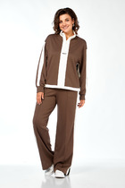 Комплект женский, 2-х предметный, состоит из жакета и и брюк. Жакет женский удлиненный, из текстильной ткани, на подкладке, полуприлегающего силуэта с центральной бортовой застежкой на пуговицы до линии перегиба лацкана. Спереди рельефные швы от плечевого шва, отрезной бочок и карман с клапаном. Спинка с рельефами от плечевого шва. Рукав втачной, двухшовный, по низу рукава обработана шлица на петли-пуговицы. Воротник пиджачного типа. Длина по спинке 66 см, длина рукава 62 см.Брюки прямые,классические, с заутюженными стрелками,по переду обработаны карманы с отрезным бочком,застежка на тесьму-молнию и 1 пуговицу.На задних половинках обработаны вытачки и имитация карманов с листочкой, пояс в брюках притачной. Длина брюк от талии по боковому шву 100 см.