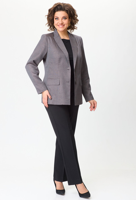 Комплект женский-двойка, из текстильной ткани, жакет удлиненный, полуприлегающего силуэта с центральной бортовой застежкой на пуговицы до линии перегиба лацкана. Спереди рельефные швы от плечевого шва, отрезной бочок и карман с клапаном. Спинка с рельефами от плечевого шва. Рукав втачной, двухшовный. Воротник пиджачного типа. Жакет на подкладке, длина по спинке 67 см, длина рукава 62 см. Брюки прямые, классические, с заутюженными стрелками, по переду обработаны карманы с отрезным бочком, застежка на тесьму-молнию и 1 пуговицу. На задних половинках обработаны вытачки и имитация карманов с листочкой, пояс в брюках притачной. Длина брюк от талии по боковому шву 103 см