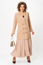 Комплект женский-двойка, из текстильной ткани, жакет удлиненный, полуприлегающего силуэта с центральной бортовой застежкой на пуговицы до линии перегиба лацкана. Спереди рельефные швы от плечевого шва, отрезной бочок и карман с клапаном. Спинка с рельефами от плечевого шва. Рукав втачной, двухшовный. Воротник пиджачного типа. Жакет на подкладке, длина по спинке 66 см, длина рукава 62 см. Брюки прямые, классические, с заутюженными стрелками, по переду обработаны карманы с отрезным бочком, застежка на тесьму-молнию и 1 пуговицу. На задних половинках обработаны вытачки и имитация карманов с листочкой, пояс в брюках притачной. Длина брюк от талии по боковому шву 103 см.