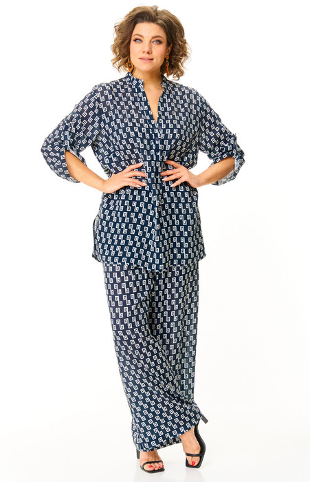Комплект женский, 2-х предметный, состоит из блузы и и брюк. Женская блуза из легкой ткани, свободного силуэта. Блузка с v-образным вырезом на притачную планку и воротником-стойкой. По спинке отрезная кокетка и складка, идущая от центра кокетки вниз. В боковых швах разрезы. Рукава укороченные, притачные, с патой. Длина рукава 50 см, длина по спинке 75 см.Легкие брюки-палаццо из тонкой хлопковой ткани, пояс на резинке, в боковых швах карманы с отрезным бочком. Длина по боковому шву 102 см, ширина внизу 31 см.