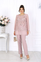 Комплект 2-х предметный состоит из жакета и брюк. Двубортный жакет, свободного кроя, на подкладке. По переду имеется отрезной бочок и вертикальные вытачки. С прорезными карманами с клапаном и двумя обтачками. Спинка цельная. Воротник пиджачного типа. Рукав двухшовный, по низу рукава обработана шлица на петли-пуговицы. Длина рукава 63 см, длина по спинке 74 см. Классические брюки, прямые, слегка заужены к низу,заутюжены стрелки,по переду обработаны карманы с отрезным бочком,застежка на тесьму-молнию и 1 пуговицу. На задних половинках обработаны вытачки и имитация карманов в рамку с двумя обтачками, пояс в брюках притачной. По низу брюк в боковом шве есть небольшой разрез. Длина брюк от талии по боковому шву 94 см.