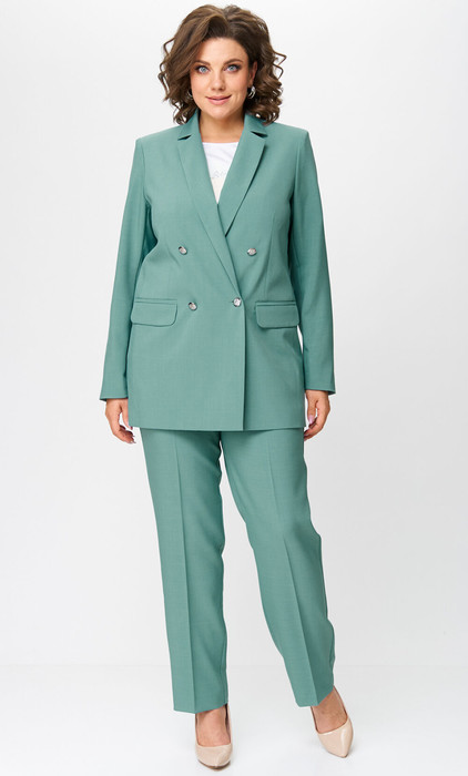 Комплект 2-х предметный состоит из жакета и и брюк. Двубортный жакет, свободного кроя, на подкладке. По переду имеется отрезной бочок и вертикальные вытачки. С прорезными карманами с клапаном и двумя обтачками. Спинка цельная. Воротник пиджачного типа. Рукав двухшовный, по низу рукава обработана шлица на петли-пуговицы. Длина рукава 63 см, длина по спинке 74 см. Брюки прямые, классические, с заутюженными стрелками, по переду обработаны карманы с отрезным бочком, застежка на тесьму-молнию и 1 пуговицу. На задних половинках обработаны вытачки и имитация карманов с листочкой, пояс в брюках притачной, по боковому на резинке. Длина брюк от талии по боковому шву 103 см.