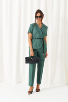 Комплект 2-х предметный из текстильной ткани состоит из жакета и и брюк. Двубортный жакет, свободного кроя, на подкладке. По переду имеется отрезной бочок и вертикальные вытачки. С прорезными карманами с клапаном и двумя обтачками. Спинка цельная. Воротник пиджачного типа. Рукав двухшовный, по низу рукава обработана шлица на петли-пуговицы. Длина рукава 63 см, длина по спинке 74 см. Классические брюки, прямые, слегка заужены к низу,заутюжены стрелки,по переду обработаны карманы с отрезным бочком,застежка на тесьму-молнию и 1 пуговицу.На задних половинках обработаны вытачки и имитация карманов с листочкой, пояс в брюках притачной. Длина брюк от талии по боковому шву 97 см.