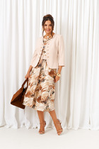 Женский комплект 2-х предметный, состоит из жакета и брюк из текстильной ткани. Жакет двубортный, свободного кроя, на подкладке. По переду имеется отрезной бочок и вертикальные вытачки. С прорезными карманами с клапаном и двумя обтачками. Спинка со средним швом. Воротник пиджачного типа. Рукав двухшовный, втачной. Длина рукава 63 см, длина по спинке 74 см. Брюки классические, прямые, заутюжены стрелки, по переду обработаны карманы с отрезным бочком, застежка на тесьму-молнию и 1 пуговицу. На задних половинках обработаны вытачки и имитация карманов с листочкой, пояс в брюках притачной, без резинки. Длина по боковому 102 см.