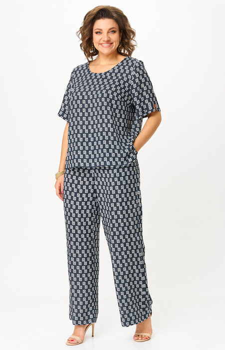 Комплект женский-двойка, из текстильной ткани, в блузе по переду есть нагрудные вытачки, по боковым швам разрезы, рукав 3/4. Брюки модель-палаццо, в боковых швах карманы, пояс на резинке, длина по боковому шву 102 см, ширина внизу 31 см. Отличный вариант на жаркую погоду.