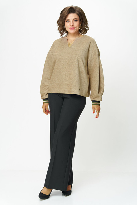 Комплект женский-двойка, блуза, свободного силуэта, из трикотажной ткани, вырез горловины V-образный,рукав немного спущенный,  фигурный, спинка цельная. Длина по спинке 59 см Брюки-палаццо,средней ширины,из плотной текстильной ткани, выполнены с карманами с отрезным бочком в боковом шве. Пояс притачной, застёжка на молнию. По задним половинкам обработаны вытачки. Длина по боковому шву 108 см.