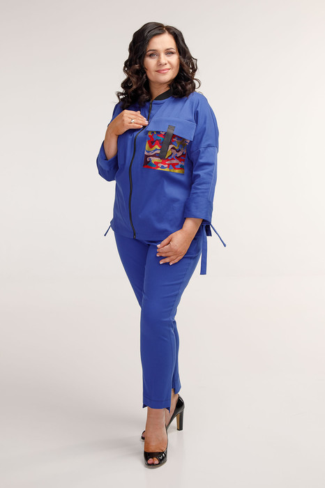Костюм женский двухпредметный: брюки+бомбер. Брюки прилегающего силуэта на поясе с карманами по бокам, пояс без резинки, переднее полотнище короче заднего на 3 см. Бобмер со спущенным рукавом с широкой притачной манжетой. Застежка молния по центру. Перед украшен накладными карманами с клапаном, один из карманов отделан дизайнерской вышивкой. По бокам бомбера разрезы с притачными хлястиками. Длина брюк- 96 см, длина бомбера - 65 см.