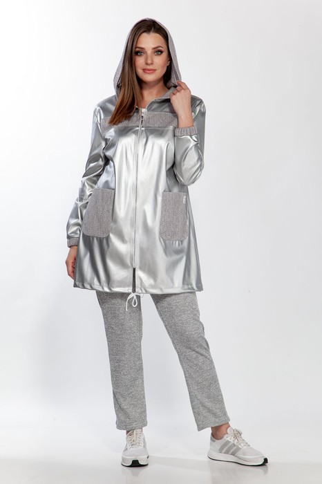 Комплект женский двухпредметный состоит из куртки и брюк. Куртка прямого силуэта выполнена из экокожи в сочетании с трикотажем. На полочке накладные карманы, с капюшоном, без подкладки, застежка молния по переду. Длина куртки по спинке 80 см, длина рукава 60 см. Брюки полуприлегающего силуэта из трикотажа с лампасами в боковых швах из отделочной ткани, пояс на резинке, с карманами. Длина брюк- 104 см.