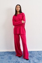 Комплект женский трехпредметный свободного силуэта. Состоит из кардигана, блузона и кюлот. Кардиган без застежки, рукав втачной 3/4 с притачным довязом. Длина кардигана 83 см. Блузон двухслойный без рукава на брителях. Кюлоты на резинке с карманами в боковых швах и на подкладке. Длина кюлот 100 см.