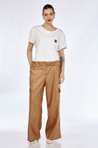 Костюм женский полуприлегающго силуэта, состоит из рубашки и брюк. Выполнен из хлопковой ткани. Рубашка с центрально-бортовой застежкой на петли и пуговицы, воротник на стойке, рукав 3/4 с притачным манжетом, в боковых швах обработаны разрезы и есть накладной карман на полочке. Брюки с высокой посадкой, пояс на резинке, в боковых швах обработаны карманы.