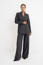 Костюм женский двухпредметный полуприлегающего силуэта, состоит из жакета и брюк. Жакет с декоративным подрезом по переду полочки, рукав втачной 3/4 с разрезом в локтевом шве, без воротника, застежка на крючек, карманы листочки обработаны в подрезе. Брюки на поясе с застежкой молния и пуговица.
