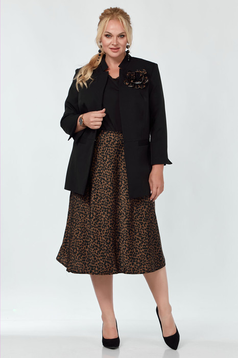 Блузка, юбка и жакет. Юбка А-образная на резинке. Блузка с целенокроенным рукавом . Жакет с  воротником стойкой,  подрезом по переду с карманом листочкой. Рукав втачной 3/ 4 с манжетом и разрезом. Жакет на подкладке.