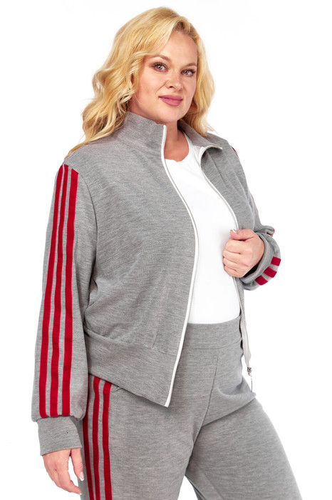 Костюм женский 2-ух предметный.Джемпер с застежкой молнией. На полочке обработаны карманы , рукав спущенный с манжетом,украшен контрастными лампасами.Брюки прямого кроя с карманами в боковых швах, пояс с резинкой .