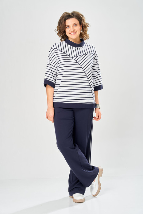 Свитшот из футера в полоску, по переду фигурные подрезы, с отделочным кантом. Горловина круглая со стойкой из однотонной ткани, линия плеча спущена, рукав втачной с однотонной манжетой по низу. Низ свитшота на планке, по боковым швам разрезы.