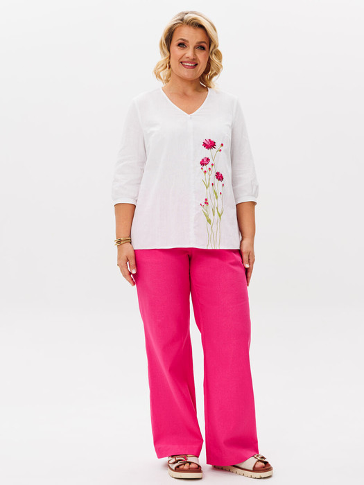 Комплект из мягкой хлопковой блузки и льняных с вискозой брюк- это стильный, удобный образ. Блузка полуприлегающего силуэта. По переду расположена нагрудная вытачка, c V- образным вырезом горловины. Рукав укороченный, со сборкой и манжетой. По переду расположена яркая дизайнерская вышивка. Спинка лаконичная. Льняные брюки свободного кроя. Пояс на резинке, для удобства в носке в пояс вставлен шнурок для регулирования объема по талии. Посадка брюк - высокая. По переду расположены карманы с наклонным входом. По низу широкая подгибка для возможности коррекции по длине. Брюки с хорошей посадкой, в этом заключается их секрет универсальности и возможности носить их девушкам с любым типом фигуры. Идеальные брюки для летней жары, в них ваша кожа будет дышать. Они выполнены из мягкого льна с вискозой. Отличный вариант, как для городского лета, работы, встреч и отдыха на море.
