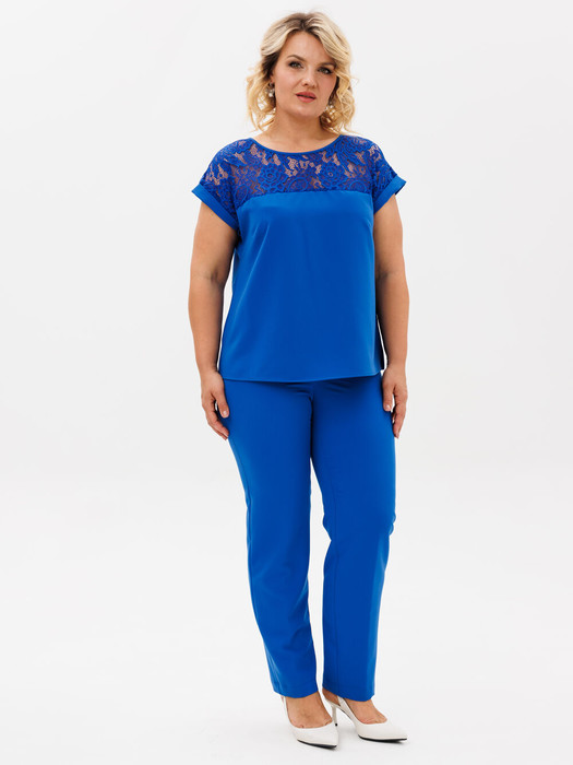 Брючный комплект: блузка из поливискозной ткани с кружевом на кокетке. Блузка полуприлегающего силуэта, спинка чуть удлиненная, рукава цельнокроеные с отложными манжетами. По переду нагрудные вытачки. Длина блузки - 61 см.Брюки классические прямого силуэта, пояс на резинке , застёжка на молнию. Длина брюк с поясом - 101 см. Отличнвй вариант на работу, на мероприятие.