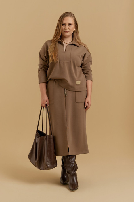 Комплект женский двухпредметный из трикотажного полотна. Джемпер- свободного покроя. Вырез горловины обработан двумя планками частично стаченными между собой и отложным воротником. Рукав отрезной на базе цельнокроеного. Юбка- прямого силуэта, на подкладке. По переду накладные карманы и небольшой разрез. Пояс отрезной на резинке, с декоративным шнуром.