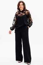 Комплект женский двухпредметный. Блуза свободного покроя. Вырез горловины асимметричной формы с воланом и декоративной патой в области плеча. Рукав один отрезной на базе цельнокроеного. В боковых швах разрезы. Брюки прямые, в боковых швах функциональные карманы. Пояс отрезной с эластичной тесьмой.