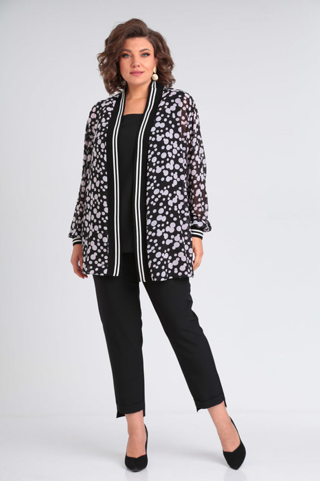 Комплект брючный (кардиган+блузон на бретелях+брюки). Кардиган из отделочной ткани прямого кроя, без застежек. Рукав втачной, одношовный. Рейки по бортам и манжеты выполнены из трикотажного довяза. Блузон на широких бретелях из основной ткани. Перед с нагрудными вытачками, спинка со средним швом, по бокам выполнены разрезы. Брюки из основной ткани, зауженные к низу. Передние половинки с застежкой-молния, задние с талиевыми вытачками. По низу спереди отложной манжет, сзади подгибка ниже передней. Пояс частично на резинке. В большом размере горловина и проймы на обтачках.