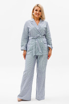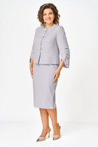 Комплект брючный состоит из жакета, брюк и майки. Жакет свободного кроя с застежкой на петлю и пуговицу. Перед с боковыми накладными карманами. Рукав втачной одношовный, со спущенной линией плеча. Воротник пиджачного типа с лацканами. Брюки зауженные к низу с боковыми карманами и застежкой "молния" спереди, талиевыми вытачками сзади и поясом частично на резинке. Майка из трикотажного полотна в полоску. Проймы и горловина обработаны бейкой.
