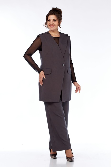 Комплект брючный состоит из жилета и брюк. Жилет с ассиметричными бортами застегивается на 1 петлю и пуговицы. Жилет полуприлегающего силуэта с отрезными бочками . Спинка сосредним швом. Перед с нагрудными вытачками и боковыми прорезными карманами в рамку с клапаном. Левая полочка с отложным лацканом, который пристегивается на 2 петли и пуговицы к плечу. Брюки прямые широкие  с застежкой на молнию спереди. Задняя половинка с талиевыми вытачками . С боковыми карманами. Пояс с резинкой и шлевками .