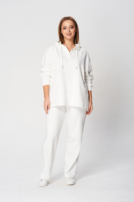 Комплект брючный (кота+брюки). Кофта полуприлегающего силуэта, спущенная линия плеча. Лампас по плечевому шву, переходящий на рукав. По низу рукава манжет. По боковым швам-разрезы. Горловина V-образная. Капюшон с отделочной деталью-планкой по отлету, для регулировки объема протянут шнурок. Брюки прямые, в боковых швах обработаны карманы. Верхний срез обработан поясом на резинке со шнуром. В качестве отделки используется  декор-кант по боковым швам брюк, кармана и лампаса рукава